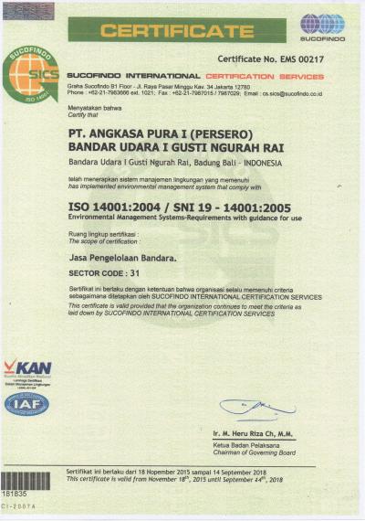 Pada tanggal 7 Desember 2015 Bandar Udara I Gusti Ngurah Rai – Bali telah memperoleh sertifikat Sistem Manajemen Lingkungan (SML) ISO 14001:2004/SNI 19-14001-2005 untuk Jasa Pengelolaan Bandara, yang dikeluarkan oleh PT. Superintending Company of Indonesia (Sucofindo).